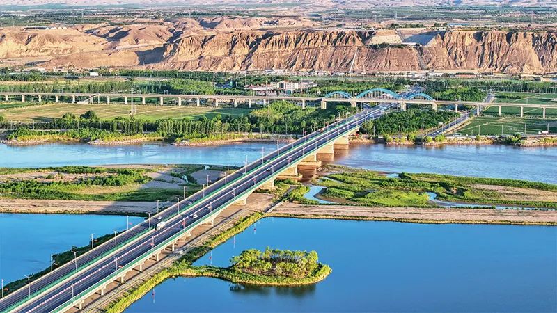 新時代生態(tài)文明建設(shè)的成就舉世矚目,成為新時代黨和國家事業(yè)取得歷史性成就、發(fā)生歷史性變革的顯著標志。圖為2023年6月13日,位于寧夏中衛(wèi)的黃河公路大橋、黃河鐵路大橋與黃河濕地交相輝映,美麗如畫。人民圖片 柴更利/攝